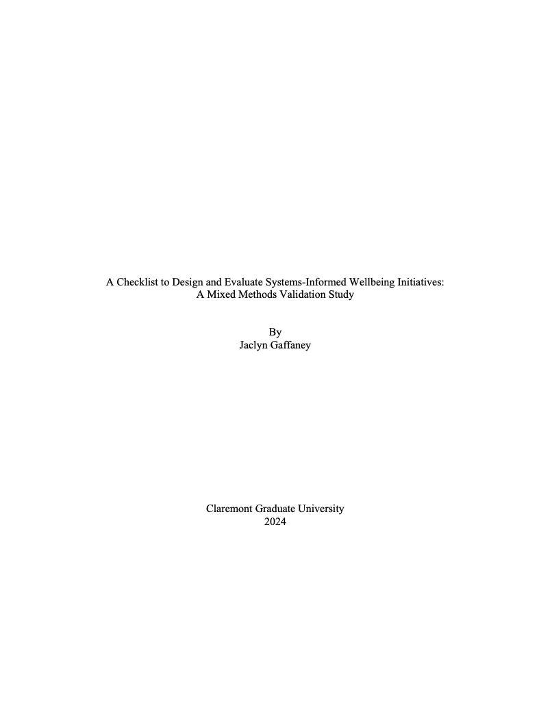 Gaffaney, J. (2024). A Checklist to Design and Evaluate Systems-Informed Wellbeing Initiatives: A Mixed Methods Validation Study (Order No. 31234773). Available from Dissertations & Theses @ Claremont University Consortium; ProQuest Dissertations & Theses Global. (3058534916). http://ccl.idm.oclc.org/login?url=https://www.proquest.com/dissertations-theses/checklist-design-evaluate-systems-informed/docview/3058534916/se-2